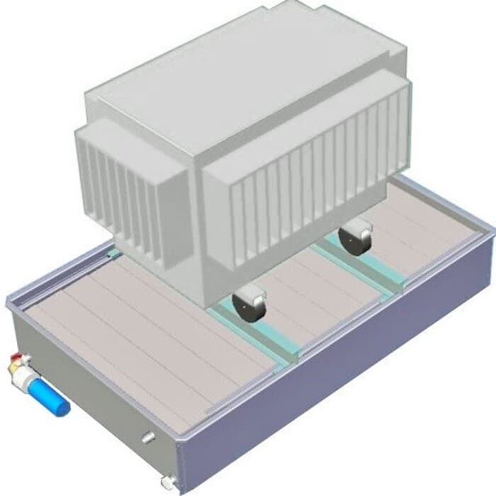 - Bac roulant pour rouler le bac directement avec le transformateur fixé dessus en réutilisant les roues du transformateur : gamme ERT-R et gamme ERT-F-R